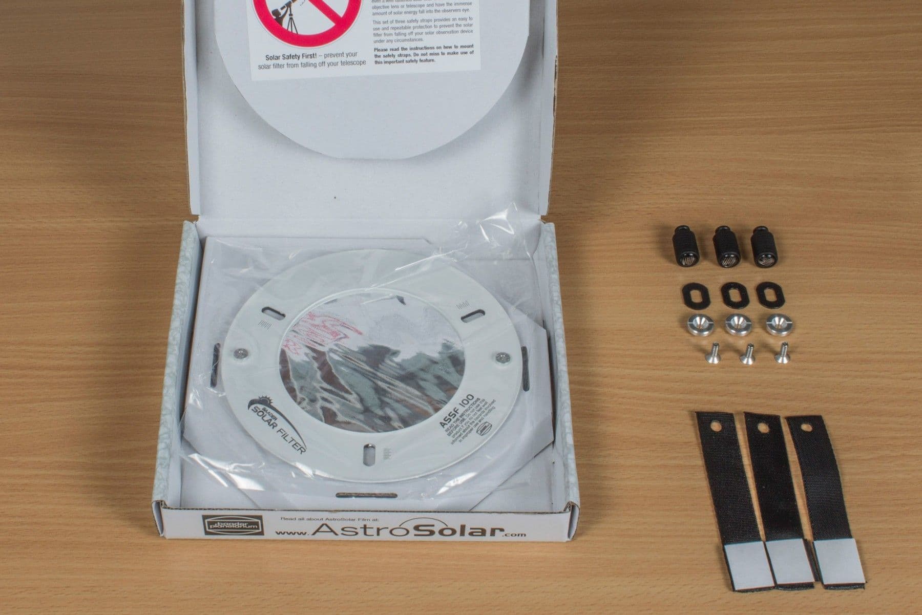 - three security straps included, to secure the position of the filter cell with Velcro-adhesive pads. A safety feature to absolutely ensure a secure fit in front of the telescope under any circumstances (gust of wind asf)