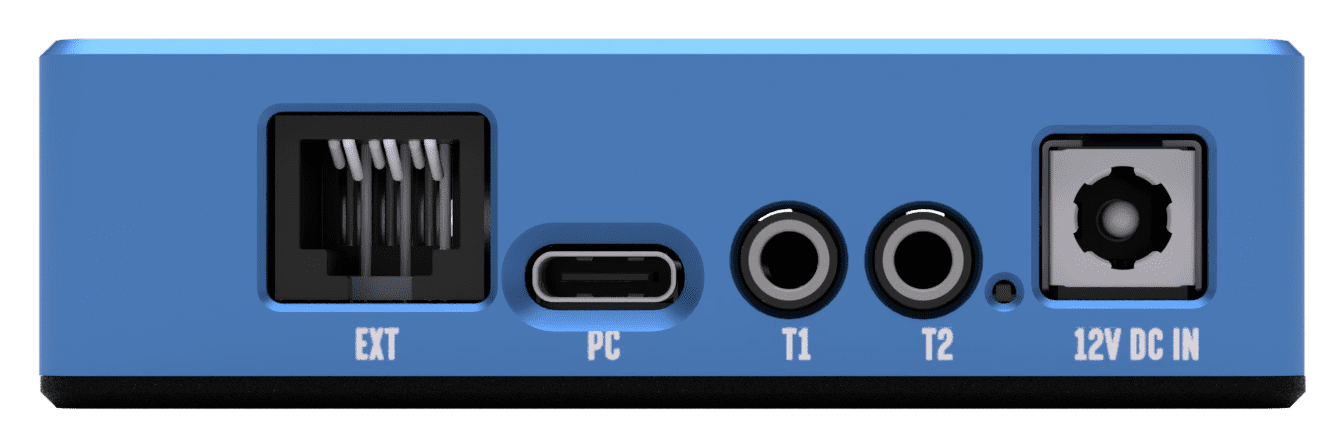From left to right, the device layout includes the environmental sensor socket, a USB-C port for remote control, two temperature sensor probe inputs, a red LED indicator and the DC power input.