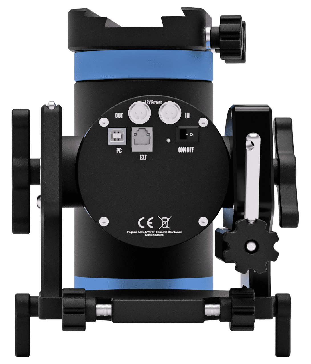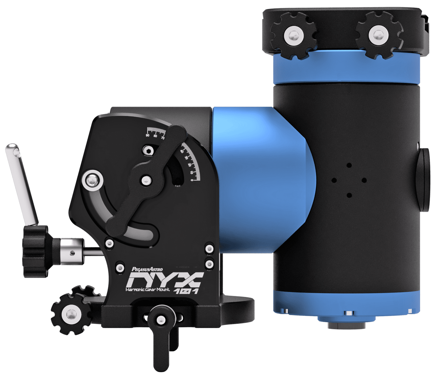 The Strain Wave drive on RA and DEC movement ensures a backlash-free operation with high torque at high payloads. A fully CNC machined aluminium alloy 6061 body, black and blue anodised, and branded parts (stepper motors, strain wave gear) inside the mount ensure the Nyx-101 will perform flawlessly for many years.