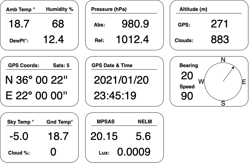 Smaller than the size of a cigarette box, and equipped with a variety of digital sensors, can precisely report the ambient temperature, humidity, pressure, cloud height, cloud coverage, astronomical twilight time, and the night sky brightness.