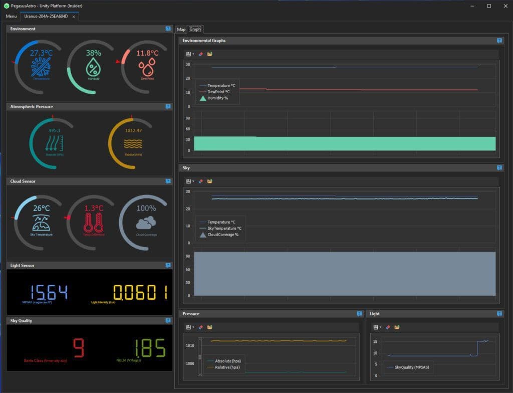Unity Platform allows monitoring and keeping a record of sensor data from day or night. Zoomable and exportable graphs keep a historic record of every observing session.
