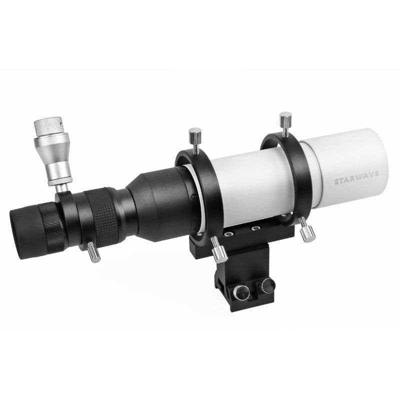 Starwave 50mm Guide Scope with a 1.25" rotating micro focuser, optical tube, rings, stalk, and universal finder bracket.
